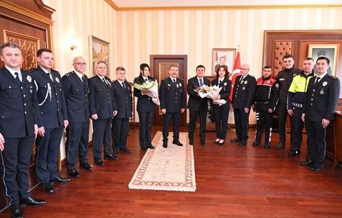 Türk Polis Teşkilatı’nın kuruluşunun 181. yıl dönümü ve 10 Nisan Polis Haftası, Kırıkkale’de düzenlenen anlamlı etkinliklerle kutlanıyor. Kutlama programları kapsamında Kırıkkale Valisi H. Engin Sarıibrahim, İl Emniyet Müdürü Mustafa Işık ve beraberindeki emniyet mensuplarından oluşan heyeti makamında kabul etti. Ziyaret sırasında İl Emniyet Müdürü Mustafa Işık, hafta boyunca gerçekleştirilecek faaliyetler hakkında Vali Sarıibrahim’e bilgi arz ederek, kabullerinden dolayı teşekkürlerini sundu.