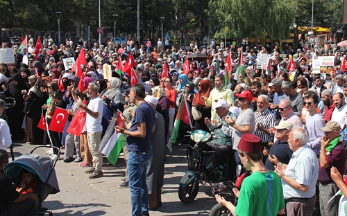 Protesto, Nur Cami İmam Hatibi Murathan Önder'in Kur'an-ı Kerim tilaveti ile başladı. Katılımcılar adına konuşan Yaşar Kaya, Gazze'de yaşanan zulüm ve vahşetin eşi benzeri olmadığını belirtti. Kaya, saldırılarda binlerce insanın vahşice katledildiğine dikkat çekerek, şunları söyledi: "Bütün insanlığın gözü önünde okulların, yetimhanelerin ve hastanelerin bahçelerinden bebek ve çocuk cesetleri toplanıyor. Günlerdir Filistin'de vatanın, toprağın, onurun, haysiyetin ve hürriyetin bir millet tarafından nasıl gasbedildiğini üzülerek izliyoruz. Filistin'de olup bitenler sadece Müslümanların değil, insanlığın ortak meselesidir. Her yaşta ve her durumdaki insanın en alçak şekilde nasıl katledildiğini, geleceğe dair umutlarının nasıl tükendiğini, insanlığın vicdanına olan güvenini nasıl yitirdiğini hepimiz görüyoruz." Vatandaşlar, Filistin halkının yanında olduklarını vurgulayan pankartlar taşıyarak, İsrail'in saldırılarını protesto etti.