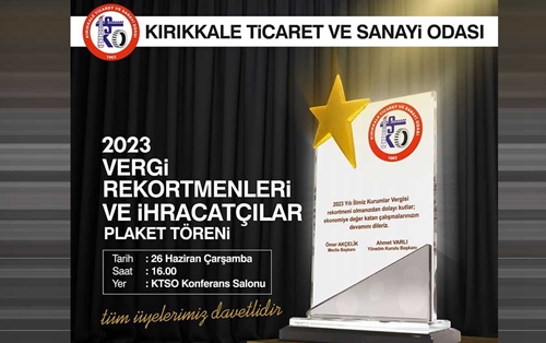 Konu hakkında açıklamalarda bulunan TSO Başkanı Ahmet Varlı, Kırıkkale için bu ödül töreninin büyük önem taşıdığını dile getirdi. Varlı ve TSO Meclis Başkanı Ömer Akçelik ile diğer protokol üyeleri tarafından verilecek ödüllerin üzerinde; "2023 yılı ilimiz kurumlar vergisi rekortmeni olmanızdan dolayı kutlar; ekonomiye değer katan çalışmalarınızın devamını dileriz" ifadesi yer alacak. Varlı, "Değerli üyelerimiz, 26 Haziran Çarşamba günü saat 16.00'da odamız Konferans Salonunda 2023 yılı Vergi Rekortmenleri ve İhracatçı Firmalar Plaket töreni düzenlenecektir. Törene tüm üyelerimiz davetlidir" dedi.