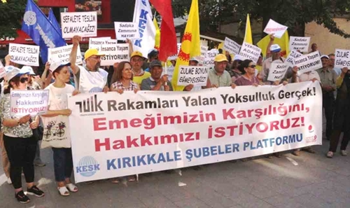 Emekçilere ve emeklilere yönelik verilen zamlara tepki göstermek amacıyla KESK Kırıkkale Şubeler Platformu üyeleri bir araya geldi. Yürüyüş düzenleyen üyeler, ellerinde aldıkları pankartlarla tepkilerini dile getirdi. Sendika üyeleri adına açıklama yapan KESK Kırıkkale Şubeler Platformu Başkanı Ayşe Avcı, “Bugün TÜİK’in yalan rakamlarıyla kamu emekçilerine ve emeklilere verilen sadaka zamlara karşı insanca yaşayacak bir ücret için ülke genelinde alanlardayız. Alanlardayız, çünkü bu ülkede emeği ile geçim mücadelesi verenler olarak tarihimizin en karanlık, en zorlu süreçlerinden birisini yaşıyoruz” dedi.
