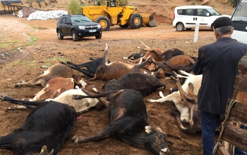 Kırıkkale'de bir çiftçi, ahırda 17 büyükbaş hayvanının telef olduğunu görünce şoke oldu. Olay, Kırıkkale Yuva Mahallesi'nde meydana geldi. Edinilen bilgiye göre, sabah hayvanlarına yem ve su vermek için ahırına giden Hüsamettin Işık, 17 hayvanının yerde yattığını ve hareket etmediğini, 2 hayvanın da rahatsızlandığını gördü. Işık, durumu hemen İl Tarım ve Orman Müdürlüğüne bildirdi. Ahıra gelen Hayvan Sağlığı Şube Müdürlüğü ekipleri, telef olan hayvanları inceledi. Hayvanlar kepçe yardımıyla toprağa gömüldü. Ekipler, hayvanların neden telef olduğu konusunda inceleme başlattı.