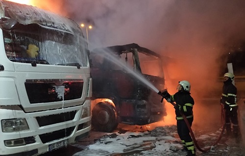Kırıkkale'nin Yahşihan ilçesinde bir dinlenme tesisinde park halindeki 3 TIR’da çıkan yangın itfaiye ekiplerince söndürüldü.