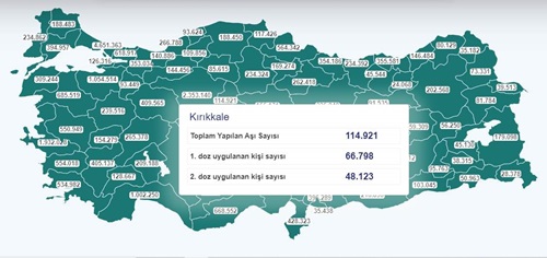 Bu güne kadar yapılan aşı çalışmasında nüfusu oranla Kırıkkale 81 il arasında 34. sırada yer alıyor. Hali hazırda nüfusun yaklaşık yüzde 24’ü birinci doz aşısını yaptırırken, yüzde 17’si de ikinci doz aşısını yaptırdı. 24 Mayıs Pazartesi günü Kırıkkale’de 536 kişinin birinci doz, 391 kişi ise ikinci doz aşısını yaptırdığı öğrenildi. Bir gün içerisinde aşı yaptıranların sayısına göre de Kırıkkale 81 il içinde 54. sırada yer aldı.