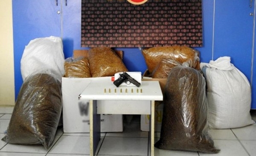 Kırıkkale'de polis ekiplerince tütün mamulleri kaçaklarına yönelik yapılan operasyonda 75 kilogram kaçak tütün ele geçirildi. Kırıkkale İl Emniyet MüdürlüÄŸü Kaçakçılık ve Organize Suçlarla Mücadele (KOM) Åžubesi ekiplerince Cumhuriyet BaÅŸsavcılığı koordinesinde kaçakçılıkla mücadele kapsamında çalışmalar sürdürülüyor. Kent merkezinde Y.K.'ya ait bir iÅŸ yerine operasyon düzenleyen polis, yapılan aramalarda 75 kilogram açık kıyılmış tütün ile 1 adet ruhsatsız tabanca, 1 adet ÅŸarjör ve 8 adet dolu fiÅŸek ele geçirdi. Operasyonda gözaltına alınan Y.K. hakkında 4733 sayılı Tütün, Tütün Mamulleri ve Alkol Piyasasının Düzenlenmesine Dair Kanun'a ve 6136 sayılı Kanun'a muhalefet suçlarından adli iÅŸlem baÅŸlatıldı.