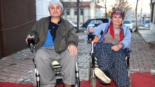 NevÅŸehir'de ilk görüÅŸte aşık olan ve 8 yıl önce 14 Åžubat'ta hayatlarını birleÅŸtiren yürüme engelli Adem ve Hatice Koç çifti birbirlerine destek olup, hayata tutunuyor. NevÅŸehir'de bir bakım merkezinde tanışan yürüme engelli Adem (40) ve Hatice Koç (46) çifti ilk görüÅŸte birbirlerine aşık oldu. Çift, 14 Åžubat 2012 yılında evlendikten sonra Kırıkkale'ye yerleÅŸti. Her ikisi de doÄŸuÅŸtan engelli. Seyyar satıcılık yapan Adem Koç, günün ilk ışığıyla akülü tekerlekli sandalyede caddelerde dolaşıp hırdavat ürünleri satarak geçimlerini saÄŸlıyor. Engelli çiftin yaÅŸam mücadelesi herkese örnek oluyor.