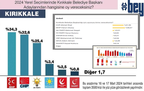 31 Mart'ta yapılacak olan Mahalli İdareler Seçimi kapsamında bey ajans Kırıkkale'de yeni bir anket yapıldı. Yerel basının da yaptığı anketler var. Anketlere göre kaybeden kesin ancak, kazanacak isimler arasında çekişme var.