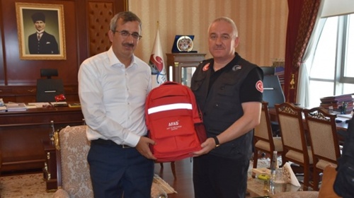 Afet ve Acil Durum Yönetimi Başkanlığı Başkan Yardımcısı İsmail Palakoğlu, Planlama ve Risk Azaltma Daire Başkanı Yusuf Aysu, Vali Yunus Sezer'i makamında ziyaret etti. İl Afet ve Acil Durum Müdürlüğünde yapılan masa başı tatbikatın ardından gerçekleşen ziyarette Başkan Yardımcısı Palakoğlu tarafından Vali Sezer'e Afet ve Acil Durum Çantası takdim edildi.