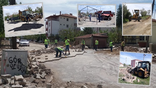 Ekipler burada asfalt yolun bozulan kısımlarını onarıyorlar ve tamirat yapıyorlar. Bozulan parke ve kaldırımlar da onarılıyor. Tahrip olan yollarda ekipler parke taşı yenileme çalışmasını sürdürüyor. Bu çalışmaya ilçe genelinde aralıksız devam edildiÄŸi bildirildi.