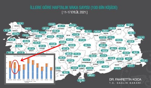Bakan Koca, ayrıca haritaya göre vaka sayısı son 1 haftada en çok artan 10 ili paylaştı. Koca, yaptığı değerlendirmede şu ifadeleri kullandı:"11-17 Eylül arasında vaka yoğunluğu bir önceki haftaya göre en çok artan 10 ilimiz; Kastamonu, Kırıkkale, Zonguldak, Tokat, Trabzon, Malatya, Yozgat, Düzce, Erzincan, Çorum. Bu illerden birindeyseniz şimdi daha da dikkatli olmalısınız. Nihai çözüm aşı, tedbirler şart."