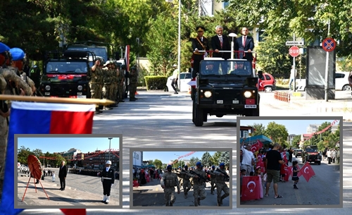 Vali Mehmet Makas, Mühimmat ve Garnizon Komutanı Tuğgeneral Mehmet Ali Durmuş, Belediye Başkanı Ahmet Önal, kurum müdürleri, şehit yakınları, gaziler ve siyasi partilerin temsilcileri ile vatandaşların katıldığı törende saygı duruşunda bulunuldu, ardından da İstiklal Marşı okundu. Fevzi Çakmak Caddesi'nde devam eden törende, Vali Makas, askeri araçla vatandaşları ve askeri birliği selamladı.