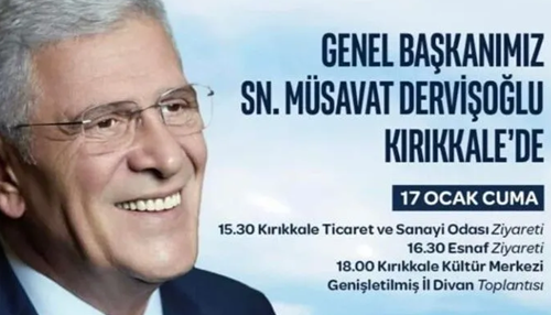 İYİ Parti Genel Başkanı Müsavat Dervişoğlu, 17 Ocak 2025 Cuma günü Kırıkkale’de bir dizi ziyaret gerçekleştirecek. Dervişoğlu, saat 15.30’da Kırıkkale Ticaret ve Sanayi Odası’nı ziyaret ettikten sonra, saat 16.30’da esnafla bir araya gelecek. İYİ Parti Genel Başkanı Müsavat Dervişoğlu, 17 Ocak 2025 Cuma günü Kırıkkale'de önemli bir dizi ziyaret ve toplantı gerçekleştirecek. Dervişoğlu’nun Kırıkkale programı, yerel halkla doğrudan temas kurma ve partinin bölgedeki faaliyetlerini güçlendirme amacı taşıyor. İlk olarak saat 15.30’da Kırıkkale Ticaret ve Sanayi Odası’nı ziyaret edecek olan Dervişoğlu, burada şehrin ekonomik durumu ve ticaret hayatı hakkında görüşmeler yapacak. Ardından, saat 16.30’da Kırıkkale esnafını ziyaret ederek, esnafın sorunlarını dinleyecek ve çözüm önerilerini paylaşacak.