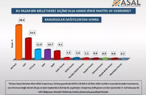 5-14 Ekim tarihleri arasındaki yapılan anketin sonuçlarına göre AK Parti, bir önceki ankete göre oyların yükseltti ve yüzde 38.4 ile ilk sırada yer aldı. CHP de ise oyların düştüğü görülürken yüzde 23.5 ile ikinci oldu. Aynı şekilde oyları azalan İYİ Parti ise yüzde 11'de kalarak üçüncü sırada yer aldı. Yaptığı çıkışlarla dikkat çeken Ümit Özdağ'ın liderliğini yaptığı Zafer Partisi'nin de oylarını artırdığı görüldü. Diğer partilerin oy dağılımı ise şöyle oldu: HDP: Yüzde 10.7, MHP: Yüzde 9.1, Zafer: Yüzde 1.5, DEVA: Yüzde 1.4, Y. Refah: Yüzde 1.1, SP: Yüzde 0.9, GP: Yüzde 0.9, BBP: Yüzde 0.8, MP: Yüzde 0.7.