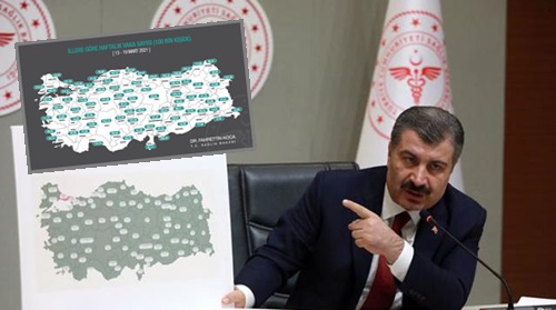 Bakan Koca'nın paylaştığı Türkiye haritası üzerinden yayımlanan verilere göre, Kovid-19 vaka sayısı her 100 bin kişide İstanbul'da 251,12, Ankara'da 107,99, İzmir'de 111,41 oldu. Her 100 bin kişide en çok Kovid-19 vakası görülen iller, Samsun, Giresun, Sinop, Balıkesir ve Yalova, en az vaka görülen iller de Şırnak, Siirt, Hakkari, Mardin ve Şanlıurfa olarak belirlendi. İllerin her 100 bin kişide haftalık (13-19 Mart) Kovid-19 vaka sayısı şöyle: