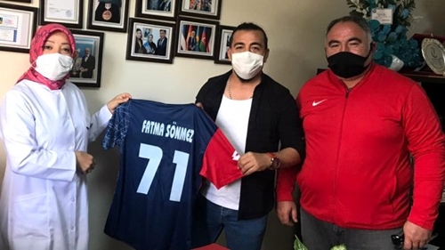 Teşekkürlerimizi iletmek için hem ziyaret ettik hem de forma hediye ettik. Bu süreçten önce de sezon içindeki sağlık problemlerimizle yakından ilgilendiler. Her zaman bize katkıda bulundular. İnşallah şampiyonluk kutlamalarında da kendilerini bekliyoruz" dedi. Kırıkkale'de yaklaşık 19 yıldır sağlık sektöründe çalıştığını belirten Dr. Fatma Sönmez, "İlk kez bir formam oluyor. Çok duygulandım, şeref duydum. Bu forma ile takımın şampiyonluğunu da bu sene kutlamak istiyorum. Her zaman olduğu gibi korona virüs sürecinde de en iyi şekilde sağlık hizmetimizi vermeye çalışıyoruz. Bizleri unutmadığınız için teşekkür ederiz" ifadelerini kullandı.