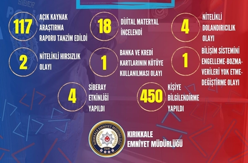 Siber Suçlarla Mücadele Åžube MüdürlüÄŸü tarafından 14-20.12.2023 tarihleri arasında Cumhuriyet BaÅŸsavcılığı koordinesinde operasyonlar düzenlendi. GerçekleÅŸtirilen operasyonlarda, 117 adet kullanıcı/kiÅŸi tespiti yapılmış, 18 adet dijital materyal İncelenmiÅŸ, 4 adet nitelikli dolandırıcılık olayı, 2 adet nitelikli hırsızlık olayı, 1 adet banka ve kredi kartlarının kötüye kullanılması olayı, 1 adet biliÅŸim sistemini engelleme-bozma-verileri yok etme veya deÄŸiÅŸtirme olayı ile ilgili iÅŸlem baÅŸlatıldı. Ayrıca 4 adet Siberay etkinliÄŸi kapsamında 450 vatandaÅŸ bilgilendirildi.