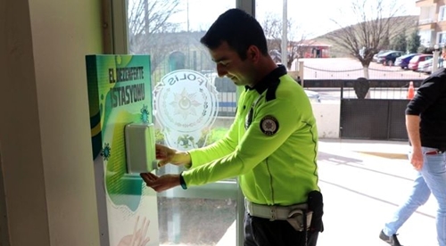 Kırıkkale'nin Yahşihan Belediyesi, Korona virüs (Kovid-19) salgınına karşı ilan ettiği seferberlik kapsamında insan yoğunluğun en çok olduğu noktalara dezenfektan standı kurdu.