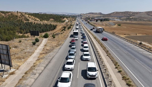Ulaşımda 43 ilin geçiş güzergahı olan "kilit kavşak" Kırıkkale'de, yol yapım çalışmaları nedeniyle trafik adeta durma noktasına geldi. Kırıkkale-Ankara D200 karayolunun 14'üncü kilometresinde, Irmak köyü virajları mevkisinde Karayolları tarafından başlatılan çalışmalar kapsamında ulaşım tek şeritten kontrollü olarak sağlanıyor. Çalışmaların devam ettiği bölgede yaklaşık 6 kilometrelik araç kuyruğu oluştu. Sıcak havada yavaş ilerleyen trafikte sürücüler zor anlar yaşarken, bekleme süreleri dakikaları buldu. Yoğunluğun en çok hissedildiği güzergah, dron ile görüntülendi.