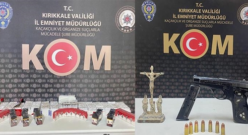 Kırıkkale Cumhuriyet Başsavcılığı koordinesinde İl Emniyet Müdürlüğü Kaçakçılık ve Organize Suçlarla Mücadele Şubesi ekiplerince, kaçak ürün ticareti yapan şahıslara yönelik çalışmalar sürüyor. Edinilen bilgiye göre, son bir haftada yapılan operasyonlarda, 344 paket kaçak sigara, tarihi eser niteliği taşıyan 1 adet obje, 1 tabanca ele geçirildi. Polis ekiplerince gözaltına alınan 6 şüpheli hakkında da adli işlem başlatıldı.