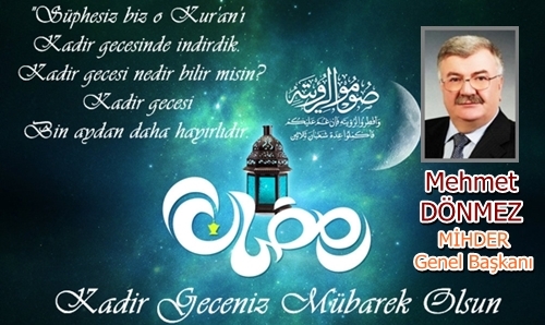 MİHDER Genel BaÅŸkanı Mehmet Dönmez, Kadir Gecesi’nin önemine iÅŸaret ettiÄŸi mesajında ÅŸunları söyledi: “Birlik, beraberlik, kardeÅŸlik ve dayanışma duygularının had safhaya ulaÅŸtığı 11 Ayın Sultanı olan Ramazan Ayı’nın son günlerine yaklaşırken, bin aydan daha hayırlı olan Kadir Gecesi’ne kavuÅŸmuÅŸ olmanın heyecanı ve sevincini yaşıyoruz. Kadir Gecesi, Kuran-ı Kerim’in övdüÄŸü, esenlik ve huzurun her tarafa yayıldığı sema kapılarının açıldığı, dua ve tövbelerin kabul edildiÄŸi bir gecedir. Bu mübarek ay ve bu güzel gecenin hürmetine tüm hemÅŸerilerimin ve İslam Alemi’nin Mübarek Kadir Gecesi’ni en içten dileklerimle tebrik eder, ülkemize ve tüm insanlığa barış, saÄŸlık ve esenlikler getirmesi temennisiyle, saygılar sunarım.”