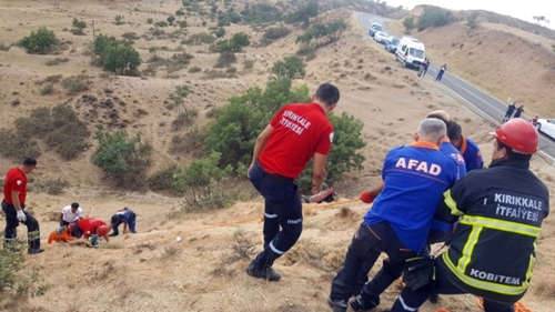 Kırıkkale'de takla atan otomobil 30 metrelik yamaçtan aşağı yuvarlandı. Meydana gelen kazada 2 kişi hayatını kaybetti. Kaza, Kırıkkale'nin Keskin ilçesinin Ceritmüminli köyünde meydana geldi. Edinilen bilgiye göre, seyir halinde direksiyon hakimiyetini kaybeden Ömer Sakallı, 71 DH 926 plakalı otomobiliyle takla atarak yaklaşık 30 metrelik yamaçtan aşağıya yuvarlandı. Kazayı gören bir vatandaş ise 112 acil servis sağlık ekiplerine haber verdi. Olay yerine gelen sağlık ekipleri sürücü Ömer Sakallı'nın olay yerinde hayatını kaybettiğini belirledi. Ağır yaralı Ferit Pekcan ise kaldırıldığı hastanede hayatını kaybetti. Olay yerine gelen AFAD ve itfaiye ekipleri aracın içindeki cesedi, halat ve sedye yardımıyla 30 metrelik yükseklikten çıkarttı. Sakallı ve Pekcan'ın cesedi Kırıkkale Yüksek İhtisas Hastanesi morguna götürüldü. Kazayla ilgili tahkikat başlatıldı.