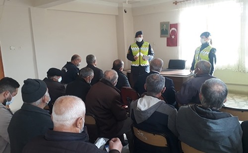 Köy yıllarındaki trafik kazalarını azaltmak maksadıyla Jandarma ekipleri köylüleri trafik konusunda bilgilendiriyor.