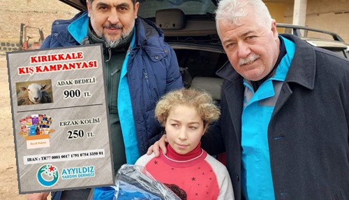 Ayyıldız Yardım DerneÄŸi tarafından, Ocak 2022 tarihinde baÅŸlatılan, Kırıkkale kış yardım kampanyası devam ediyor. Dernek Genel BaÅŸkanı Seyit Ahmet Acar açıklamasında kampanyaya destek veren hayırseverlere teÅŸekkür etti. Kurban adağı (900 TL) ve erzak kolisi (250 TL) olarak devam eden kampanyada toplanan gelirle Kırıkkale’de dar gelirli ailelere Kırıkkale temsilciliÄŸi tarafından yardımlar ulaÅŸtırılacak. Yardım kolilerinin içersinde 2 kilo kırmızı et, tavuk, zeytin, peynir, pirinç, bulgur, kabuklu badem, yumurta, kraker, 5 kilo un ve çikolata yer alıyor.