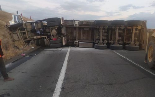 Kırıkkale'nin Delice ilçesinde devrilen tırın sürücüsü yaralandı. Kaza esnasında TIR’da bulunan kömür tozu yola saçıldı.