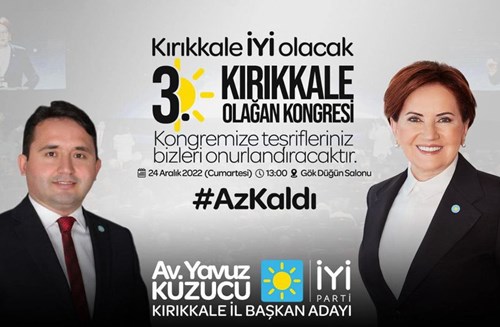 İyi Parti Kırıkkale İl Başkanlığı kongresi hafta sonu yapılıyor. Kongre ile ilgili hazırlıklar devam ederken, kamuoyuna kongreye davet çağrısı yapıldı. Kongreyle ilgili olarak, “İYİ Parti, Kırıkkale İl Kongresi 24.12.2022 Cumartesi günü Gök Düğün Salonunda saat 13.00’de yapılacaktır. Tüm dostlarımızı bekleriz” paylaşımı yapıldı.