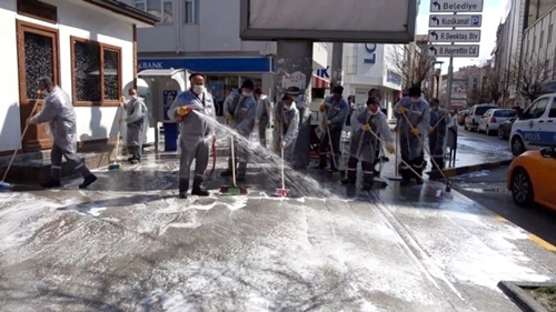 Kırıkkale Belediyesince oluşturulan 'Hijyen timi' yeni tip korona virüs (Covid-19) tedbirleri kapsamında kentte sıkça kullanılan alanları köpüklü su ve dezenfektan ile temizledi. Çin'de ortaya çıkan ve tüm dünyaya hızla yayılan Korona virüs tehdidi sonrasında temizlik yapılmak üzere ülke çapında harekete geçildi. Bu kapsamda Kırıkkale Belediyesi de ilk andan itibaren alarak hayata geçirdiği tedbirleri sürdürüyor. Alınan üst düzey önlemlere son olarak Temizlik İşleri Müdürlüğü ve İtfaiye ekiplerinin temizlik çalışmalarıyla devam edildi. Oluşturulan 'hijyen timi' tarafından kentte sıkı bir hijyen çalışması başlatıldı. Ekiplerce son olarak her gün yüzlerce kişinin geçtiği Demokrasi ve Cumhuriyet Meydanı'nın yanı sıra sıkça kullanılan parklar, cadde ve sokaklar özel ekip tarafından köpüklü su ile fırçalanarak temizlendi. Ekiplerin dezenfekte çalışmaları vatandaşlar tarafından takdirle karşılandı.