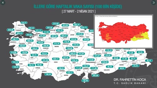 İllerin her 100 bin kişide haftalık (27 Mart-2 Nisan) Kovid-19 vaka sayısı şöyle: Adana 111,26 - Adıyaman 230,69 - Afyon 153,21 - Ağrı 121,96- Aksaray 257,91 - Amasya 370,50 - Ankara 272,79 - Antalya 190,44 - Ardahan 185,11 - Artvin 164,60 - Aydın 153,16 - Balıkesir 430,63 - Bartın 232,69 - Batman 57,39 - Bayburt 244,17 - Bilecik 340,62 - Bingöl 124,57 - Bitlis 47,29 - Bolu 287,80 - Burdur 92,85 - Bursa 260,43 - Çanakkale 546,77 - Çankırı 305,57 - Çorum 322,56 - Denizli 94,15 - Diyarbakır 60,05 - Düzce 217,85 - Edirne 409,06 - Elazığ 153,92 - Erzincan 321,20 - Erzurum 245,16 - Eskişehir 358,90 - Gaziantep 171,86 - Giresun 503,88 - Gümüşhane 206,07 - Hakkari 36,72 - Hatay 132,95 - Iğdır 225,52 - Isparta 157,39 - İstanbul 591,45 - İzmir 218,88 - Kahramanmaraş 112,83 -Karabük 202,78 - Karaman 196,53 - Kars 106,34 - Kastamonu 453,00 - Kayseri 315,94 - Kırıkkale 179,76 - Kırklareli 518,33 - Kırşehir 158,00 - Kilis 385,88 - Kocaeli 371,11 - Konya 426,17 - Kütahya 190,57 - Malatya 373,87 - Manisa 139,04 -Mardin 48,91 - Mersin 122,12 - Muğla 146,59 - Muş 54,49 - Nevşehir 209,53 - Niğde 239,18 - Ordu 459,94 - Osmaniye 316,47 - Rize 404,81 - Sakarya 241,98 - Samsun 678,72 - Siirt 50,74 - Sinop 360,34 - Sivas 164,97 - Şanlıurfa 40,70 - Şırnak 23,43 - Tekirdağ 409,13 - Tokat 334,86 - Trabzon 353,49 - Tunceli 170,18 - Uşak 84,72 - Van 42,55 - Yalova 564,03 - Yozgat 234,55 - Zonguldak 205,85.