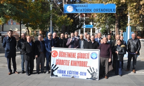 Türk Eğitim-Sen eğitim çalışanlarına yönelik şiddeti önlemek amacıyla farkındalık yaratmaya devam ediyor. 81 il’de eş zamanlı yapılan etkinlik çerçevesinde Türk Eğitim Sen Kırıkkale Şubesi Başkanı Yücel Karabacak ve yönetim kurulu üyeleri ve eğitimci üyeler Atatürk İlköğretim Okulu önünde basın açıklamasında bulundu. Basın açıklamasını okuyan Şube başkanı Karabacak “Türk Eğitim-Sen şube başkanları ve şube yönetim kurulu üyeleri, öğretmenlerimiz ve eğitim çalışanlarımız ile birlikte tüm illerden Sayın Cumhurbaşkanı’na mektup gönderiyoruz. 81 ilden 81 mektup gönderen sendikamız, öğretmenlik mesleğinin itibarını rencide eden yayın, söylem ve tutumlardan sakınılmasının önemine dikkat çekerek, şiddet olaylarının faillerine en ağır müeyyideler uygulanmasını istedi ve “Yapanın yanına kar kalmasın” diyoruz” ifadesini kullandı.