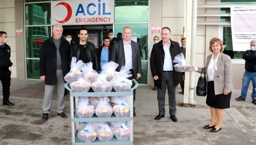 Kırıkkale Belediye BaÅŸkanı Mehmet Saygılı, yeni tip koronavirüs (Kovid-19) ile mücadelede özveriyle görev yapan saÄŸlık çalışanlarına moral vermek için ziyaret meyve ikramında bulundu. Saygılı, dünyayı etkisi altına alan koronavirüs salgınına karşı özveriyle çalışan saÄŸlık çalışanlarını Kırıkkale Üniversitesi Tıp Fakültesi Hastanesi ve Yüksek İhtisas Hastanesinde ziyaret etti. Hazırlanan meyve sepetlerini saÄŸlık çalışanlarına ikram eden Saygılı, özverili çalışmalarından dolayı teÅŸekkür etti. Saygılı, salgına karşı en büyük mücadeleyi saÄŸlık çalışanlarının verdiÄŸini belirterek, "İlimizdeki bütün doktorlarımız, hemÅŸirelerimiz, saÄŸlık çalışanlarımız taktire ÅŸayan fedakarlık göstermekteler. En riskli meslek olmasına raÄŸmen görevlerini fedakarca ve büyük bir özveriyle yerine getiriyorlar. Bu çalışmalarından dolayı onlara Kırıkkale halkımız adına sonsuz teÅŸekkür ediyoruz." ifadelerini kullandı. SaÄŸlık çalışanları da BaÅŸkan Saygılı'ya teÅŸekkür etti.