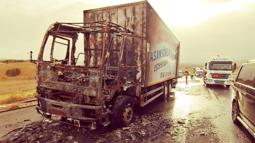 Kırıkkale'de bir nakliye firmasına ait ev eÅŸyasının yüklü olduÄŸu kamyon çıkan yangında kullanılamaz hale geldi. Olay, Kırıkkale- Samsun D-200 kara yolunun 14. kilometresindeki meydana geldi. Edinilen bilgiye göre, Sadık Y. idaresindeki 06 EV 39 67 plakalı kamyon, seyir halinde ilerlerken aracın alt bölümünden yangın çıktı. Rüzgarında etkisiyle alevler büyüdü. İhbar üzerine olay yerine Kırıkkale Belediyesi İtfaiye ekipleri sevk edildi. Yangına müdahale eden ekipler, yarım saatlik çalışmanın ardından yangını söndürdü. SoÄŸutma çalışmalarının ardından kamyon kullanılamaz hale gelirken içindeki eÅŸyalarda küle döndü.