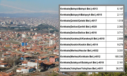 Kayıt sistemine göre Kırıkkale nüfusu da belli oldu. Bir önceki kayda göre, yani Kırıkkale nüfusu 2023 yılına göre 285.744 olarak ölçüldü. Bu nüfus, 142.651 erkek ve 143.093 kadından oluşmakta. Yüzde olarak ise: %49,92 erkek, %50,08 kadın. Son açıklanan rakamlara göre ise Kırıkkale merkez nüfusu 185.336 olarak görülüyor. Sırasıyla ilçe nüfusları ise şu rakamlardan oluşuyor: Bahşılı 6187, Balışeyh 2117, Çelebi 1018, Çerikli 2360, Delice 3711, Karakeçili 2806, Keskin 9279, Hacılar 3331, Sulakyurt 2161, Yahşihan 36070. İlçe nüfus toplamı bu sonuçlara göre ilçelerin nüfus toplamı 69 bin 40 olarak belirlendi. İl merkezi nüfusu ise 185 bin 336 olarak açıklandı.