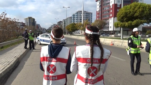 Kırıkkale'de "Okulumun Trafik Polisiyim" projesi kapsamında öğrenciler, polislerle birlikte uygulama noktasında sürücülere broşür dağıtarak emniyet kemeri takmaları konusunda uyarılarda bulundu. Kırıkkale'de Alparslan Türkeş Bulvarı'nda "Okulumun Trafik Polisiyim" projesi kapsamında trafik polisleriyle birlikte emniyet kemeri uygulamasına katılan gönüllü öğrenciler, sürücülere broşür dağıtarak emniyet kemeri takmaları konusunda uyarılarda bulundu. Araç içerisindeki çocuklara da ebeveynlerinin hatalı araç kullandığı zaman uyarmaları için "kırmızı düdük" verdi. Kırıkkale'de trafik denetimlerini yoğunlaştıran İl Emniyet Müdürlüğü Trafik Şube ekipleri il merkezindeki kavşaklarda uygulama noktaları oluşturdu. Proje kapsamında polisler ile birlikte önceden eğitim alan görevli 40 öğrenci uygulama noktalarında sürücüleri hatalı araç kullanmamaları konusunda uyarılarda bulunuyor. Her uygulama noktasında 2 öğrenci polislerle birlikte uygulamaya katılıyor. Öğrencilerin uygulama noktalarında görevli olmasından dolayı sürücüler, memnun kaldıklarını ifade etti.