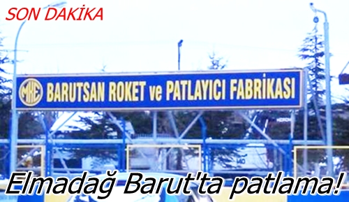 Ankara'nın Elmadağ ilçesinde bulunan Makine Kimya Endüstri Kurumu (MKEK) barut fabrikasında patlama meydana geldi. Patlamada bir kişi hayatını kaybetti 3 kişi yaralandı. Ankara'nın Elmadağ ilçesinde bulunan Makine Kimya Endüstrisi Kurumu (MKEK) Barutsan Roket ve Patlayıcı Fabrikası patlama meydana geldi. Patlamada bir kişi hayatını kaybetti 3 kişi yaralandı. Olayla ilgili çalışma başlatıldı. Patlamının sebebi araştırılıyor.