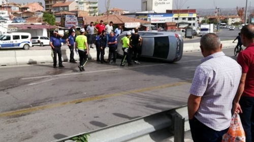 Kırıkkale'de kontrolden çıkan otomobil, bariyerlere çarpması sonucu yan devrildi.