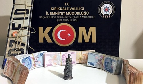 Kırıkkale'de polislerce durdurulan otomobilin torpidosunda kadın ve yılan figürlü heykel ile 45 bin lira ele geçirildi, iki şüpheli gözaltına alındı. İl Emniyet Müdürlüğü Kaçakçılık ve Organize Suçlarla Mücadele Şubesi ekipleri, 2863 sayılı Kültür ve Tabiat Varlıklarını Koruma Kanunu'na muhalefet suçunu önlemeye yönelik çalışma kapsamında, Yozgat'tan kente geldiği öğrenilen bir otomobili Kırıkkale-Ankara kara yolundaki uygulama noktasında durdurdu. Aracın torpido kısmında beze sarılmış halde, tarihi eser olduğu değerlendirilen kadın ve yılan figürlü heykel ile 45 bin lira, bagajda ise araca ait olmayan plaka bulundu. Gözaltına alınan H.S. (39) ve E.Y. (43), emniyetteki işlemlerinin ardından adliyesine sevk edildi.