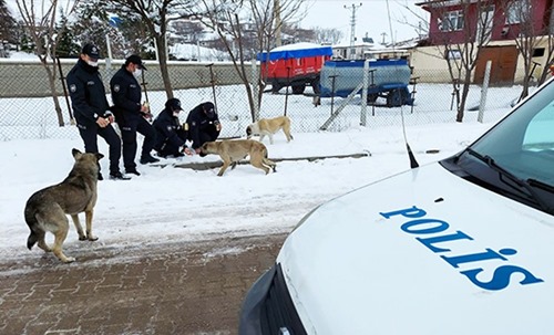 Kırıkkale'nin Sulakyurt ilçesinde polis ekipleri, kar sebebiyle yiyecek bulamayan sokak hayvanlarını mama ile besledi.