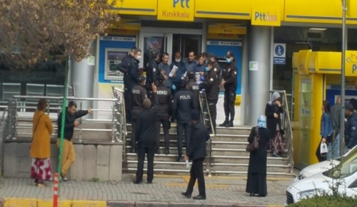 Kırıkkale PTT Merkez Şubesi'nde yoğun kalabalığı ve yığılmaları önlemek için polis ve bekçiler tarafından önlem aldı.