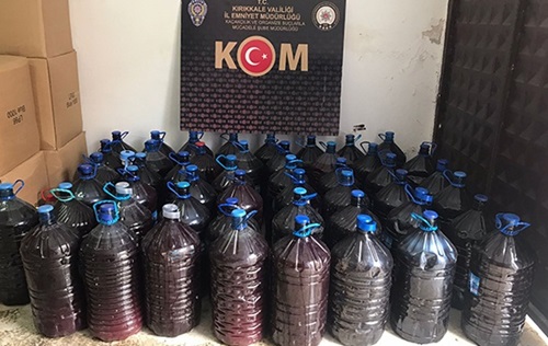 İl Emniyet Müdürlüğü Kaçakçılık ve Organize Suçlarla Mücadele Şubesi ekipleri, Kırıkkale Cumhuriyet Başsavcılığı koordinesinde "Kaçakçılıkla Mücadele Kanunu"na muhalefet suçunu önlemeye yönelik yaptığı saha ve analiz çalışmaları kapsamında E.Ç'nin (36) Ovacık Mahallesi Zafer Caddesi'ndeki iş yeri ve deposunda arama yaptı. Aramada, 19'ar litrelik damacanalarda toplan 931 litre sahte şarap ele geçirildi. Gözaltına alınan şüphelinin emniyetteki işlemleri sürüyor.