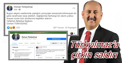 YahÅŸihan Belediye BaÅŸkanı Osman Türkyılmaz akÅŸam saatlerinde saldırıya uÄŸradı. YeniÅŸehir’de yaÅŸanan olayda yürüyüÅŸ yaptığı öÄŸrenilen Belediye BaÅŸkanı Osman Türkyılmaz'a kimliÄŸi bilinmeyen bir ÅŸahıs tarafından saldırı gerçekleÅŸtirildiÄŸi kaydedildi. Türkyılmaz'ın vücudunun bazı yerlerinden darp edildiÄŸi, saÄŸlık durumunun iyi olduÄŸu, hastane de kontrol altında tutulduÄŸu öÄŸrenildi. Olayla ilgili emniyet soruÅŸturma baÅŸlattı.