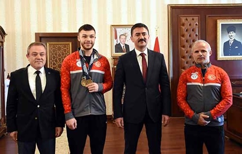 TekbıyıkoÄŸlu, Yunanistan'ın Girit adasında yapılan ÅŸampiyonada, koparmada 150 ve toplamda elde ettiÄŸi 324 kiloluk dereceleriyle 2 altın madalya elde eden milli sporcu Kurnaz'a, çeyrek altın taktı. Kurnaz da Vali TekbıyıkoÄŸlu'na milli takım forması hediye etti.TekbıyıkoÄŸlu, Hakan'ın sık sık ziyaretçileri olduÄŸunu belirterek, her ÅŸampiyonadan sonra kabul ettiklerini söyledi.Hakan Kurnaz'ın, Kırıkkale'nin yetiÅŸtirdiÄŸi en büyük genç sporculardan birisi olduÄŸunu aktaran TekbıyıkoÄŸlu, "Kendisi gelecek vadeden bir sporcumuz. Bundan sonraki ÅŸampiyonalarda da aynı baÅŸarıyı kendisinden bekliyoruz. Böyle bir umudumuz var. Kendisiyle gurur duyuyoruz. BaÅŸarılarının artarak devam etmesini temenni ediyorum." diye konuÅŸtu. Milli sporcu Kurnaz da "10 yıldır halterle ilgileniyorum. Gençler Dünya Åžampiyonası'nda altın madalya alarak İstiklal Marşı'mızı okuttum. Valimize de çok teÅŸekkür ederim. Bundan sonraki hedefim büyüklerde dünya ÅŸampiyonu olmak." ifadelerini kullandı. Ziyarette, Gençlik ve Spor İl Müdürü Aziz Sinan Alp de yer aldı.