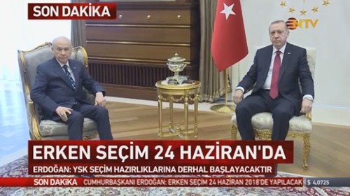 Türkiye'de gözlerin çevrildiği Recep Tayyip Erdoğan ile Devlet Bahçeli arasındaki 'erken seçim' zirvesi 14.00 sularında sona erdi. MHP lideri Bahçeli görüşme sonrasında açıklama yapmadan partisinin genel merkezine döndü. Cumhurbaşkanı Erdoğan, Beştepe'deki kritik zirvenin ardından erken seçim ile ilgili açıklamalarda bulundu. Erdoğan erken seçime gideceklerini açıkladı ve tarih olarak da 24 Haziran'ı belirlediklerini söyledi. Yüksek Seçim Kurulu'nun da seçimle ilgili hazırlıklara başladığı bildirildi.