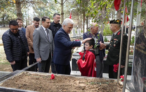 Saygı duruşu ve İstiklal Marşı ile başlayan törende, şehitler için Kur'an-ı Kerim tilaveti okundu ve dualar edildi. Törene katılan Vali Mehmet Makas, Garnizon Komutanı Tuğgeneral Mehmet Ali Durmuş ve Belediye Başkanı Ahmet Önal, şehit mezarlarına karanfil bıraktı. Protokol üyeleri, şehit aileleriyle yakından ilgilenerek başsağlığı dileklerinde bulundu. Vali Makas, Çanakkale Zaferi'nin milletin birlik ve beraberlik içinde yazdığı büyük bir kahramanlık destanı olduğunu belirterek, "Bugün, tarihimizin en şanlı zaferlerinden biri olan Çanakkale Zaferi'nin 110. yıl dönümünü idrak ediyoruz. Bu mukaddes günde, vatanımızın bağımsızlığı ve milletimizin bekası için canlarını feda eden aziz şehitlerimizi rahmet, minnet ve şükranla anıyoruz" dedi.