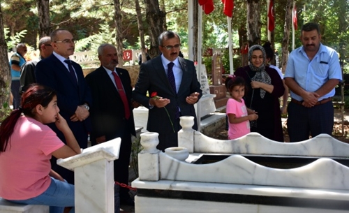 Vali Sezer, Belediye Başkanı Mehmet Saygılı, Mühimmat ve Garnizon Komutanı Tümgeneral Selami Arslan, İl Emniyet Müdürü Mahmut Çorumlu ve protokol üyeleri, daha sonra şehit mezarlarına karanfil bıraktı. Sezer ve protokol üyeleri, şehit ailelerle bir süre sohbet etti.