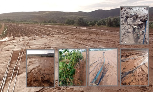 Omcalar ayrıca dolu ile zarar görürken ne yaprak kaldı ne de üzüm. Tarlalar ve baÄŸlardaki damlama sulama sistemlerinin de büyük zarar gördüÄŸü gözleniyor. Boruların kimisi sürüklenip giderken, kimisi de çamur ve çakılla dolarak zarar gördü. Bir kısmının da kırıldığı gözlendi. Çamurla kaplanan ekili alanlar çiftçiyi üzdü. Üreticiler bölgede afet ilan edilmesini ve zararlarının karşılanmasını istiyorlar.