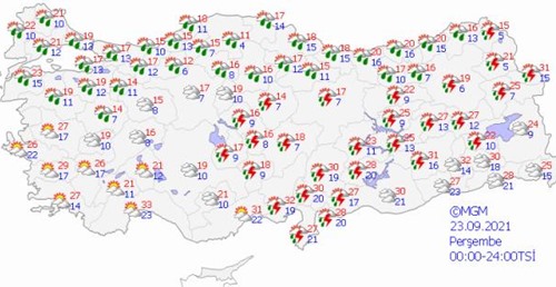 Meteoroloji'nin yayınladığı haritaya göre; salı günü başta İstanbul olmak üzere toplam 20 ilde yağmur etkili olacak. Salı günü yağmur beklenen iller şöyle;"İstanbul, Kocaeli, Yalova, Bursa, Balıkesir, Bilecik, Sakarya, Düzce, Bolu, Zonguldak, Bartın, Karabük, Kastamonu, Sinop, Samsun, Ordu, Giresun, Trabzon, Rize ve Artvin." Haritaya göre; İstanbul, Kırklareli, Tekirdağ, Edirne, Yalova, Kocaeli, Bursa, Bilecik, Sakarya, Düzce, Zonguldak, Bolu, Bartın, Karabük, Kastamonu, Sinop, Çankırı, Kırıkkale, Çorum, Samsun, Amasya, Kırşehir, Niğde, Adana, Hatay, Osmaniye, Kahramanmaraş, Kayseri, Sivas, Tokat, Ordu, Giresun, Gümüşhane, Trabzon, Bayburt, Erzincan, Rize, Artvin, Ardahan ve Kars'ta çarşamba günü sağanak yağmur görülecek.
