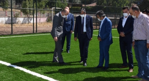 Kırıkkale Valisi Yunus Sezer, "18 okul ve mahalleye semt tipi halı saha yapım projesi" kapsamında Kaletepe Mahallesinde bulunan Geraldine Saran İlkokulu ile Yahşihan ilçesinde bulunan Organize Sanayi Mesleki ve Teknik Anadolu Lisesi bahçesine yapılan sahalarda incelemelerde bulundu.
