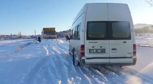 Kırıkkale'de yoğun kar nedeniyle yolda mahsur kalan okul servisi kurtarıldı.